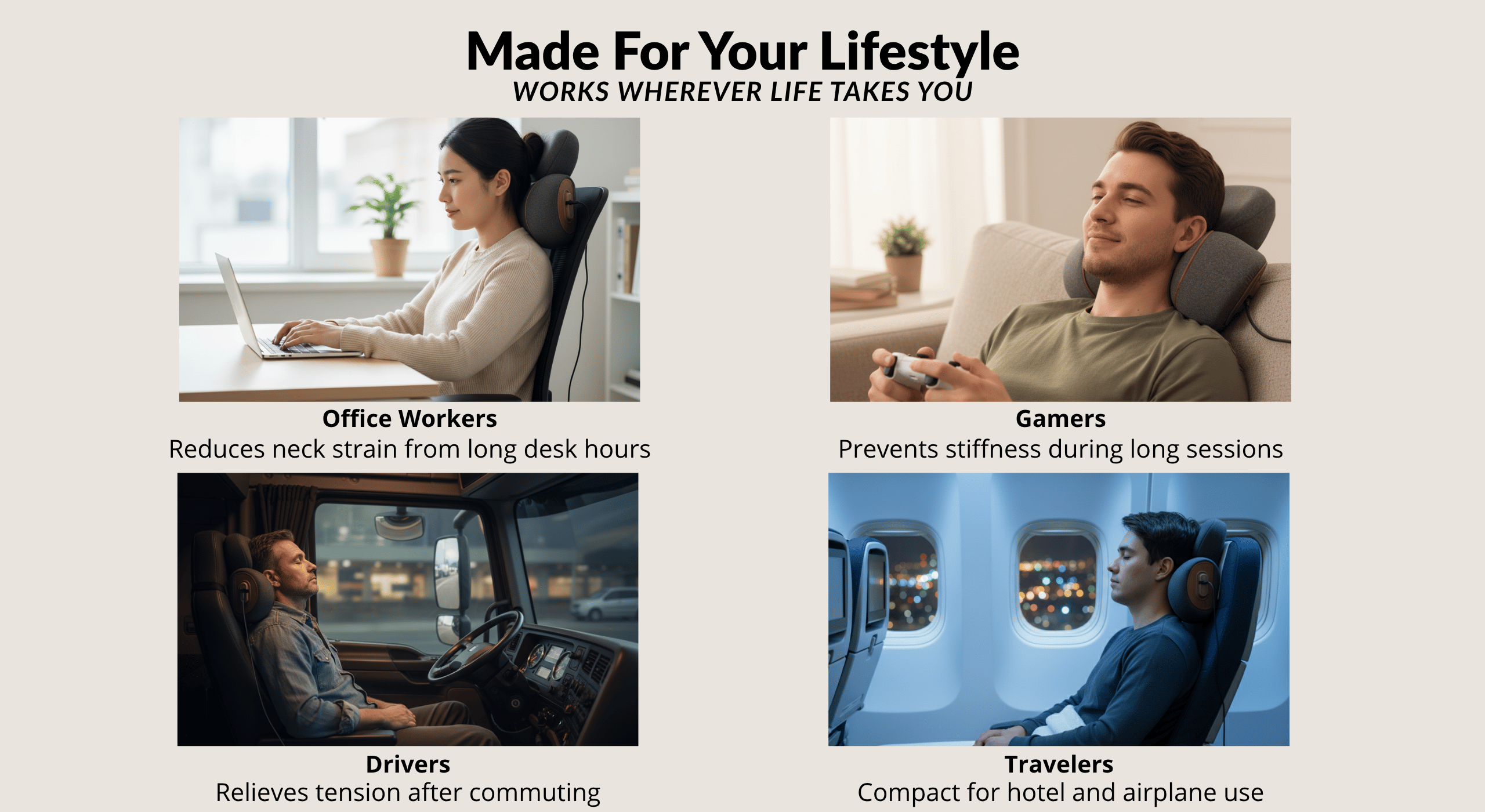 Its thoughtful, ergonomic design targets multiple sources of muscle tension and spinal misalignment — offering a holistic solution for overall neck and shoulder wellness.